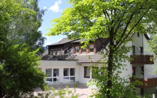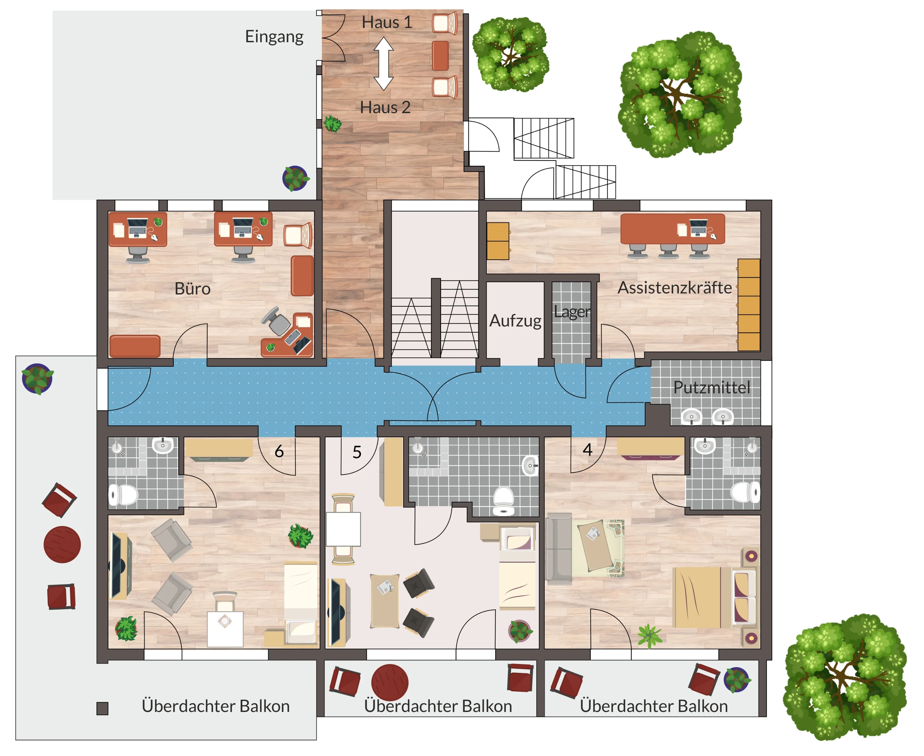 ERDGESCHOSSNeben drei Zimmern, die als Einzel- oder Doppelzimmer genutzt werden können, gibt es ein Büro für Schreibarbeiten, sowie der Durchgang in das Haus 1.