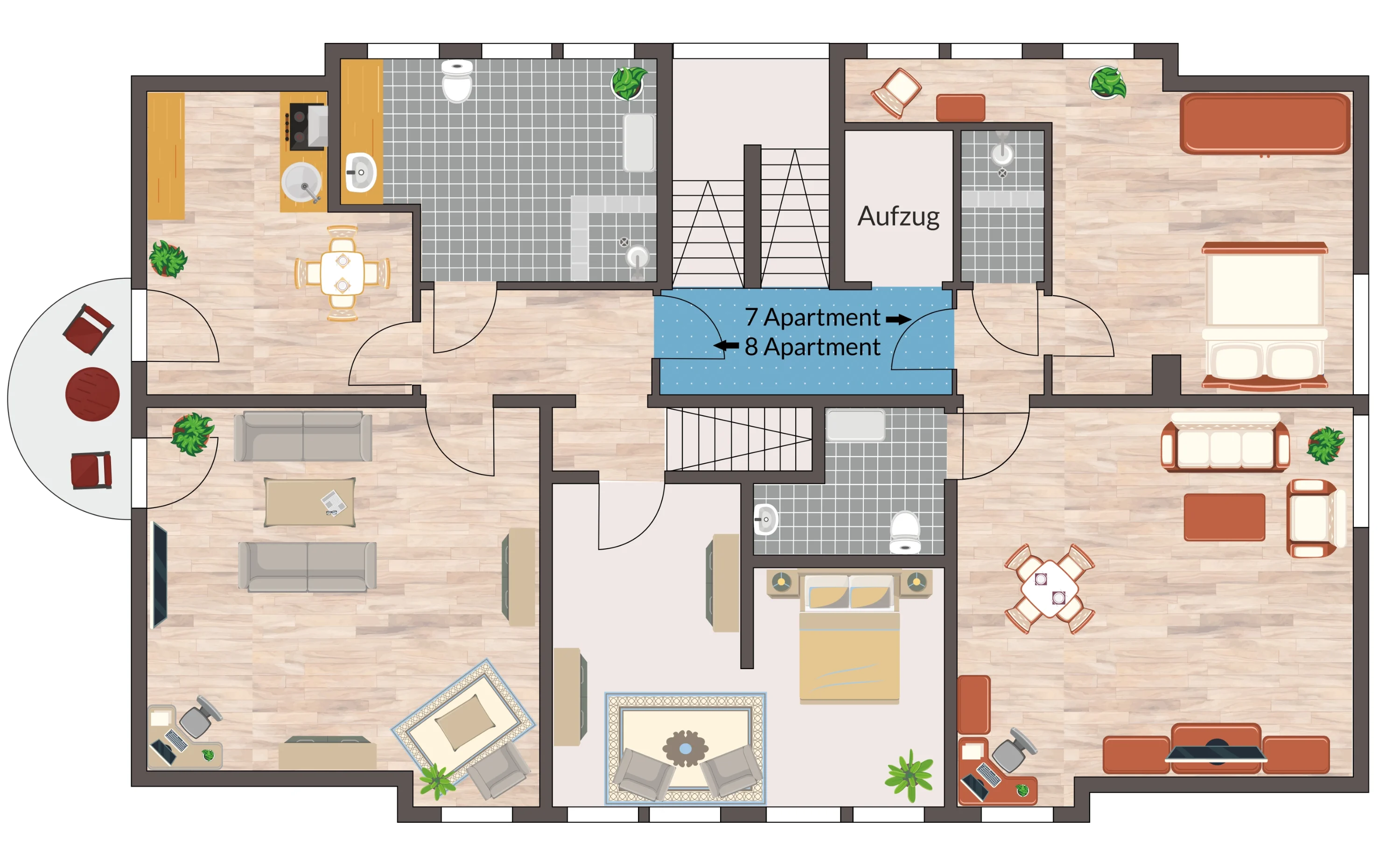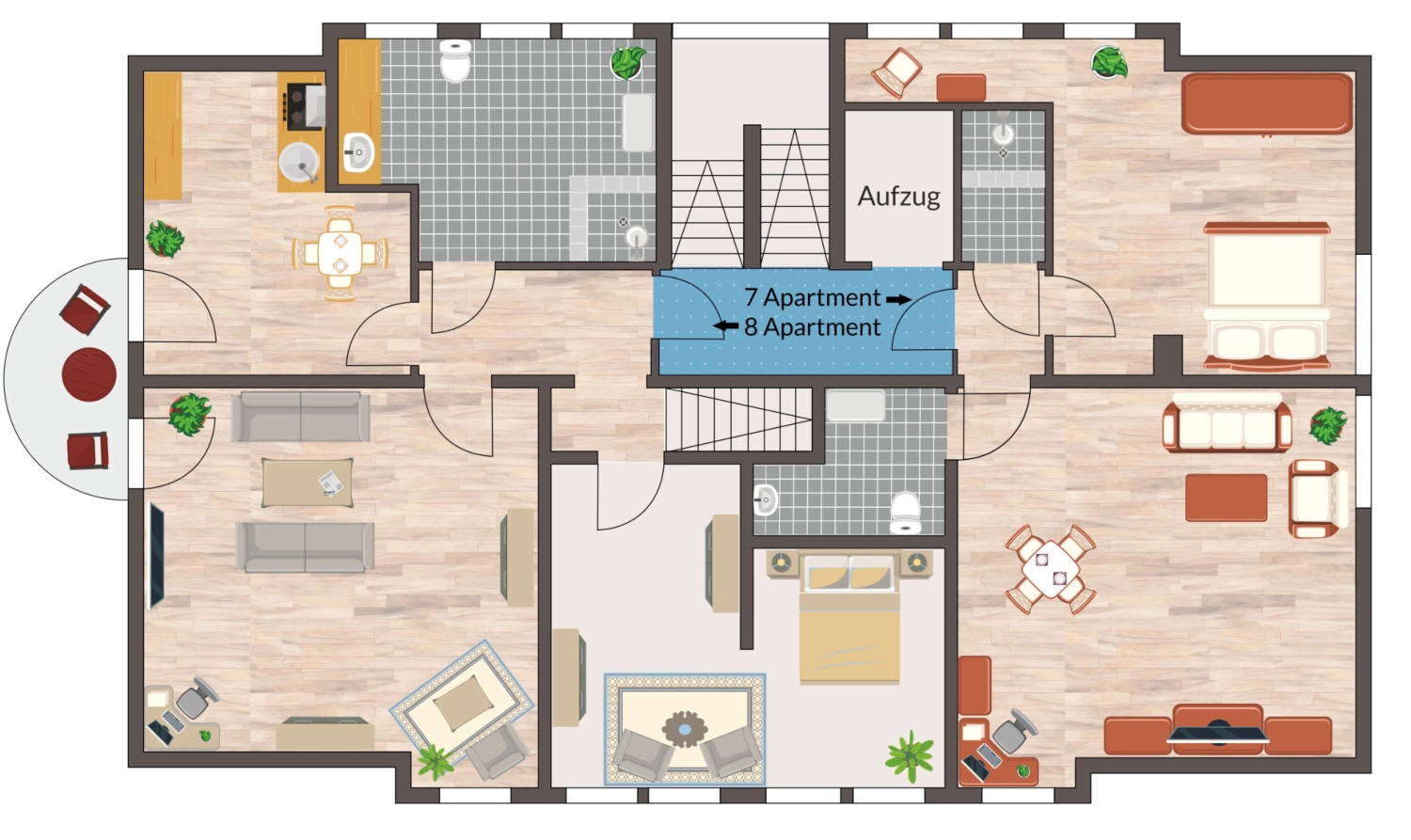 DACHGESCHOSS:Im obersten Stockwerk befinden sich zwei großzügig geschnittene Apartemens, wo von eines mit einem Balkon und einer Küche ausgestattet ist.